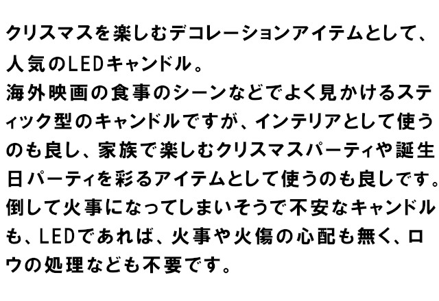 クリスマスを楽しむデコレーションアイテムとして、人気のLEDキャンドル。 |