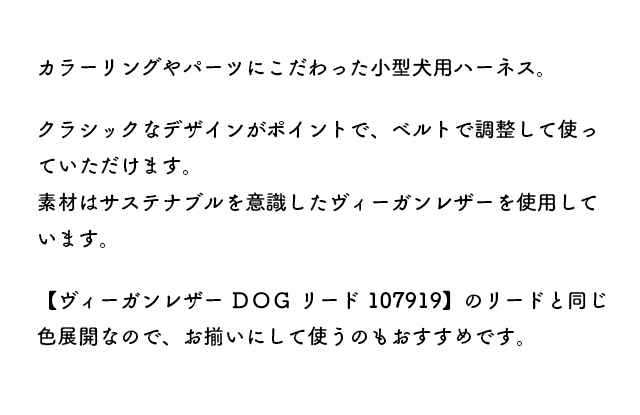 【ヴィーガンレザー DOG リード 107919】 のリードと同じ色展開なので、お揃いにして使うのもおすすめです。
