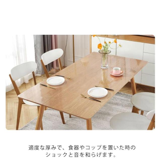 | 大切な家具をキズや汚れから保護する透明ビニールのテーブルマット テーブルマットは透明だから、テーブルの木目やデザインを損ないません。 適度な厚みで、食器やコップを置いた時のショックと音を和らげます。 マットを敷けば、食べこぼし汚れ、コップの輪染み・油染みも防ぎ、水拭き可能だからテーブルの劣化も防ぎます ビニール素材なので食べこぼしや飲み物もサッと拭けてテーブル汚れを気にせずお食事ができ、しかもお掃除が楽で清潔です。 小さなお子さんがいる家庭や離乳食マットとしても多くご利用いただいています。 | |