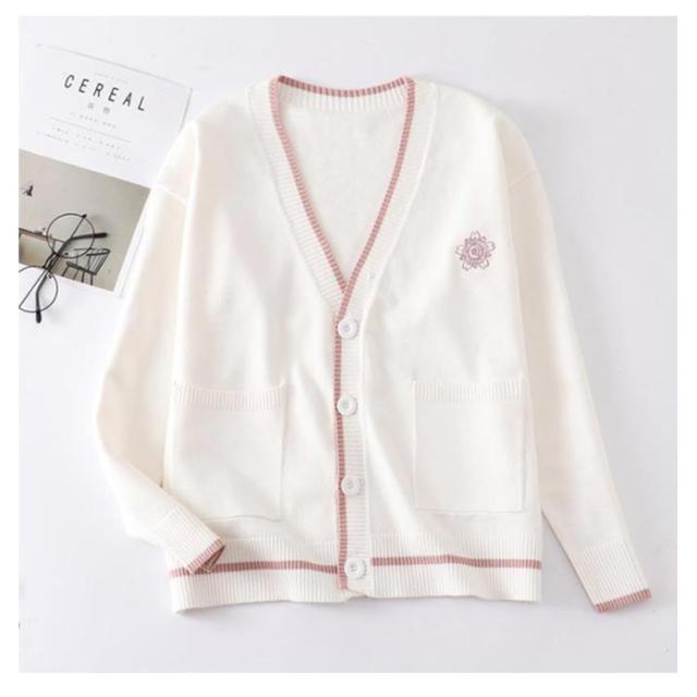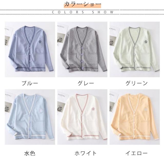 | 全6色から選べる制服カーディガン!! ちょこんと可愛い胸元の桜柄刺繍と配色ポイントラインがアクセントに♪ 程よい厚みでジャケットを上から羽織っても着膨れせず、可愛さKEEP!!! ゆったり着れるサイズ感で学校はもちろん、テーマパークやイベントでのコスプレもオシャレに決まる☆ | |