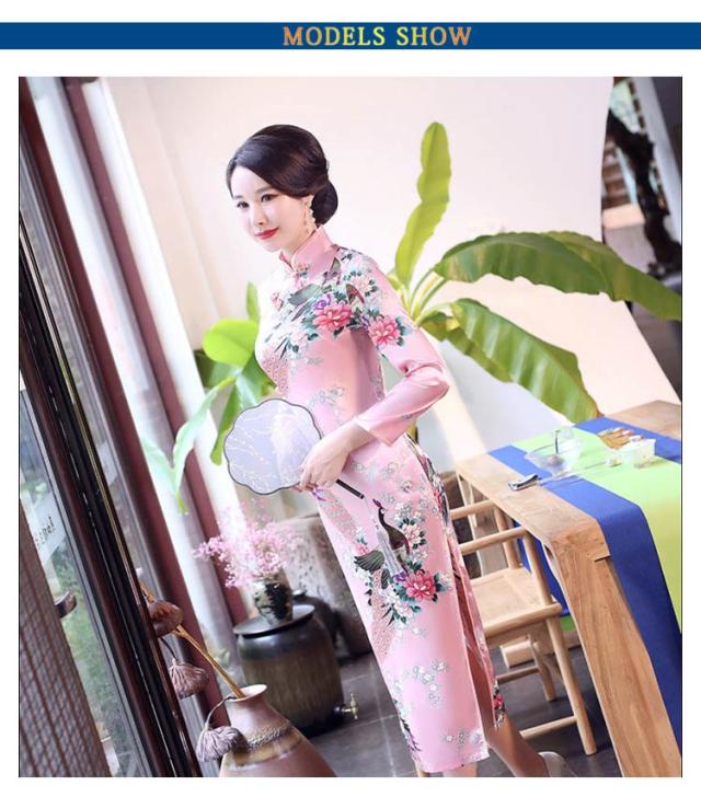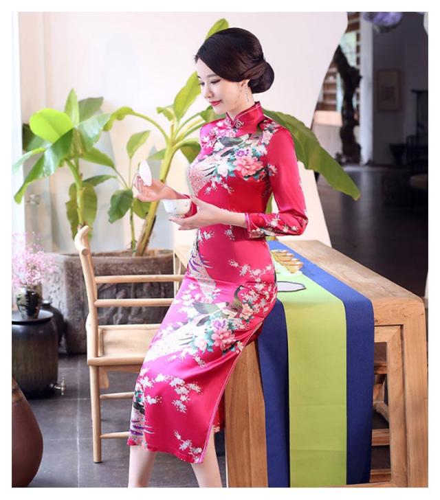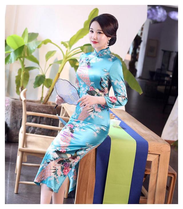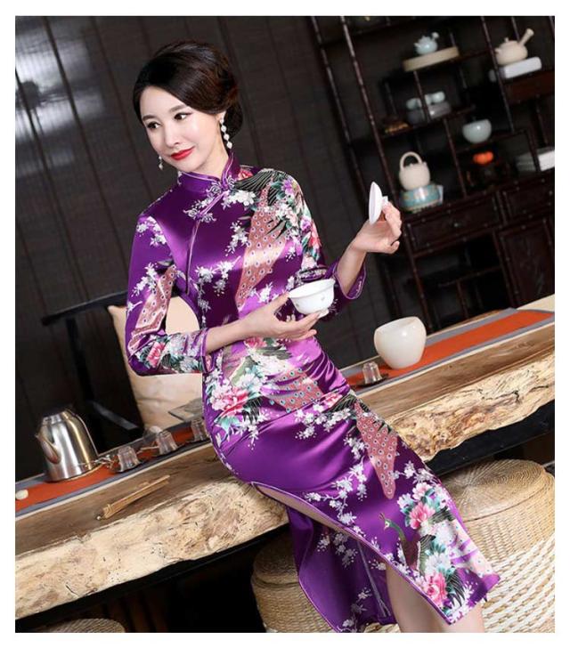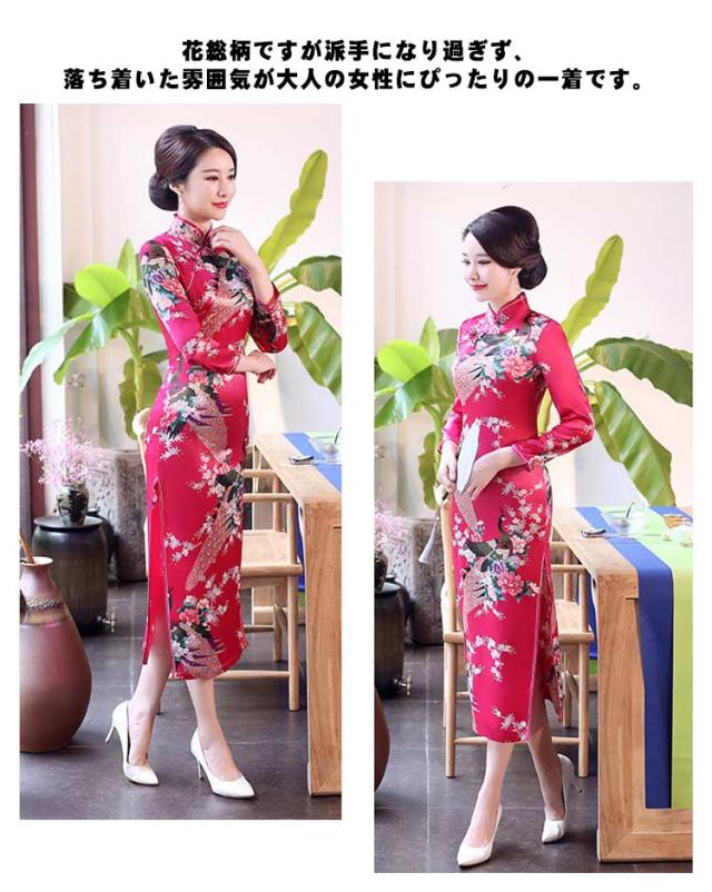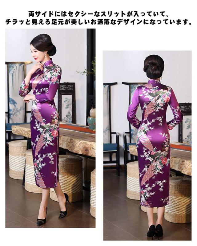 | シルク調の光沢が鮮やかで、セクシーなロング丈のチャイナ服。 クラシカルデザイン×シックなカラーが美しい、ロングチャイナドレス♪ 花総柄ですが派手になり過ぎず、落ち着いた雰囲気が大人の女性にぴったりの一着です。 ピタッとボディラインを出して着るのがおすすめなので胸元やヒップも少しタイト目な作りになっています。 両サイドにはセクシーなスリットが入っていて、チラッと見える足元が美しいお洒落なデザインになっています。 | |
