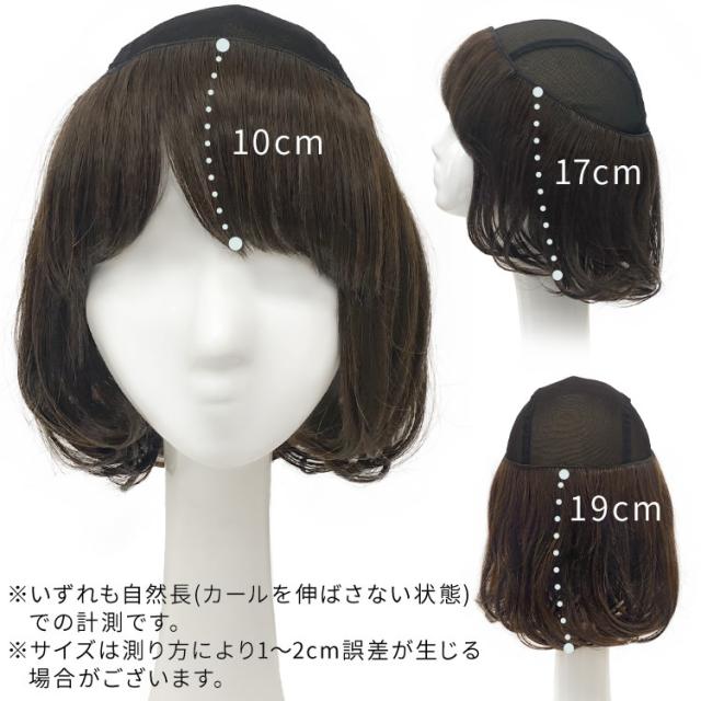 ※いずれも自然長(カールを伸ばさない状態)での計測です。若干の誤差がある場合があります。 頭囲:約55cm 重さ:約65g(重さは前髪を含みます)