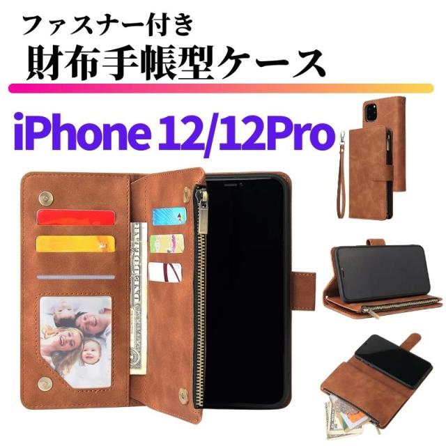 iPhone 12 12Pro スマホケース 手帳型 お財布 レザー カードケース ジップファスナー収納付 スタンド おしゃれ アイフォン カード入れ ストラップ付 大容量 耐衝撃 TPU素材 手帳 iPhoneケース ブラウン Pro