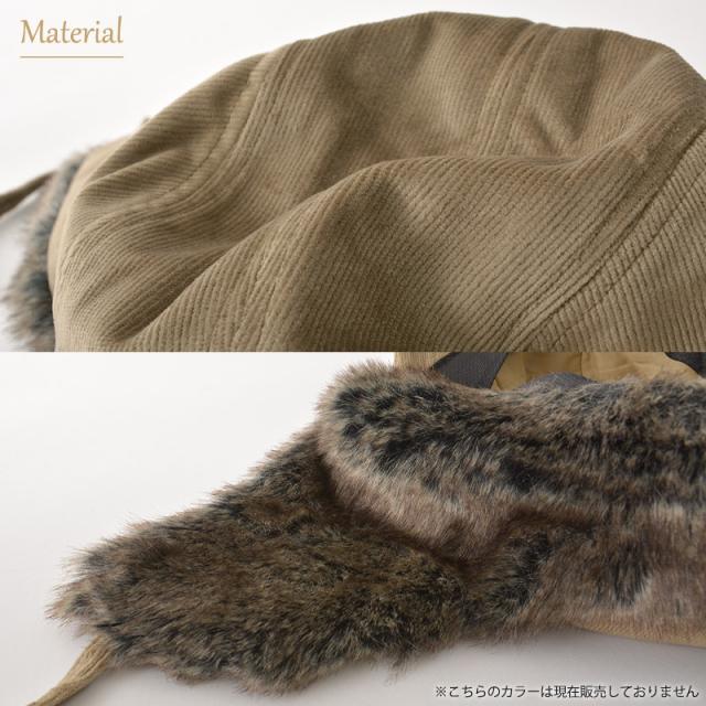 光沢感あるコーディロイ生地とファーを使用したカジュアルなフライトキャップ。