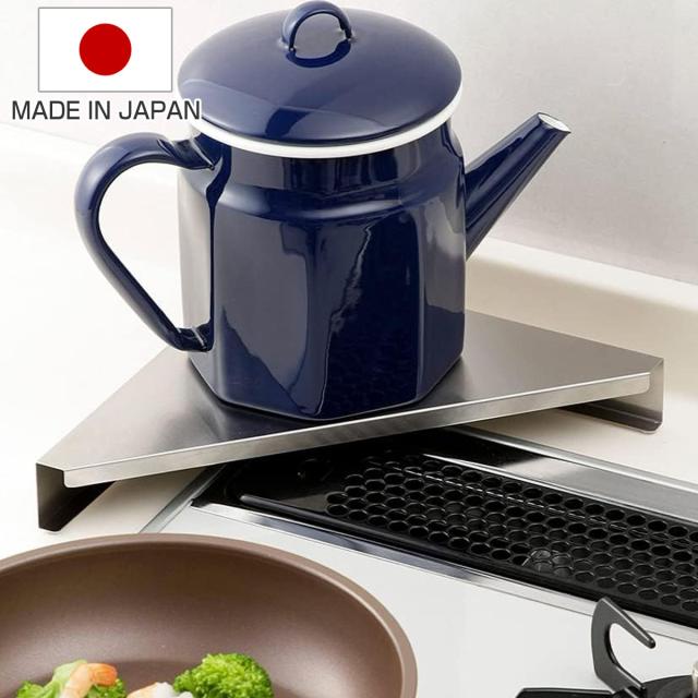 金物生産の産地、新潟県燕・三条市で作られた、コンロコーナーラックです。耐荷重15kgの丈夫なステンレス製のラックなので、調理中の熱い鍋も重たい鍋もそのまま置くことができます。プレートタイプ(ステンレス板)の棚板で、細かな調味料も安定して置けます。デッドスペースを有効活用することで、キッチンが使いやすくなり、お料理がはかどります。