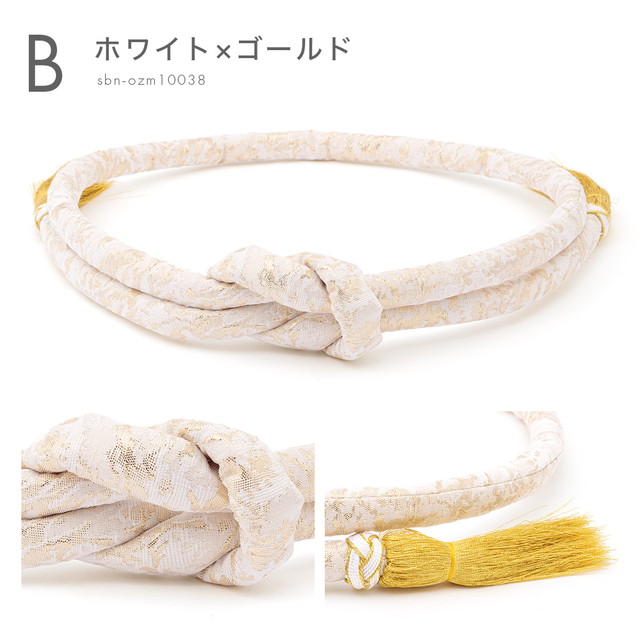 輝く金色糸や銀色糸が織り込まれた生地を丸ぐけにした豪華な帯締めです。