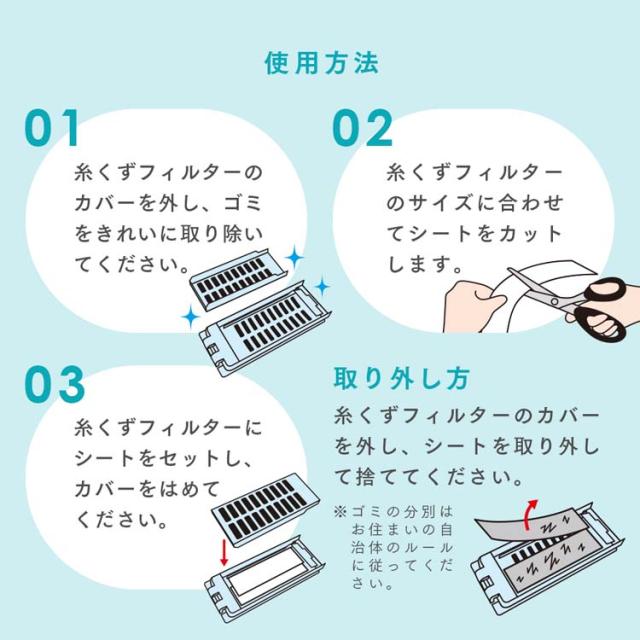 2.糸くずフィルターのサイズに合わせて本品のシートをハサミ等で1〜2枚カットします。糸くずフィルターの幅によって使用枚数(1〜2枚)を調整してください。