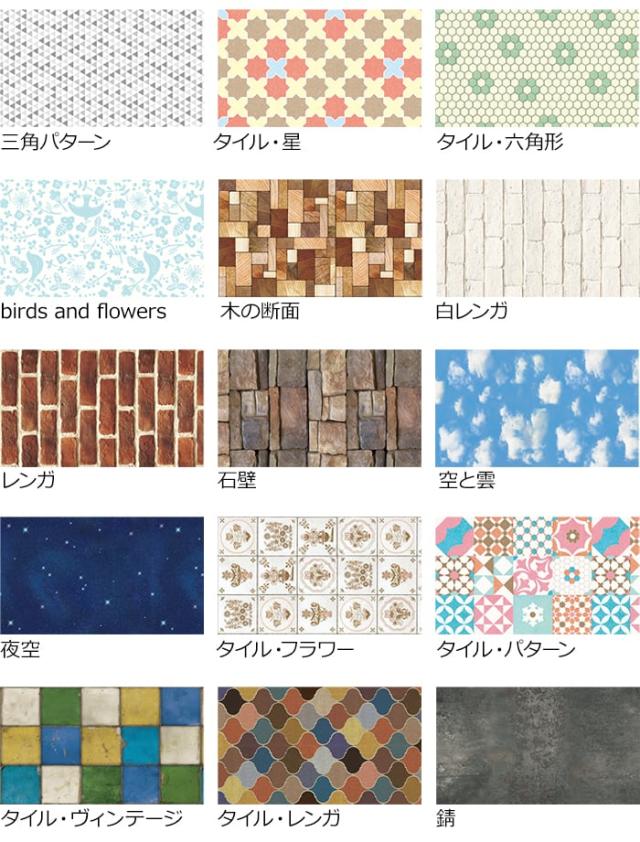 ■カラー:三角パターン、タイル・星、タイル・六角形、birds and flowers、木の断面、白レンガ、レンガ、石壁、空と雲、夜空、タイル・フラワー、タイル・パターン、タイル・ヴィンテージ、タイル・レンガ、錆
