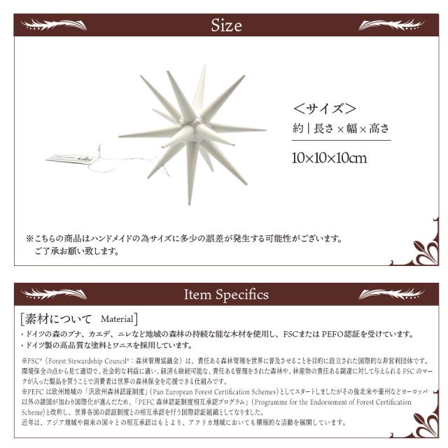 ★世界中で大人気、ドイツ東部にあるアルビン・プライスラー社の金のベツレヘム(正式名称ポインセチア)です。ターナーマイスターの初代アルビン・プライスラーが作り出した14のパーツから構成され、クリスマスのシンボルであるベツレヘムの星を表し会社のロゴとしても使われております。 マタイ福音書にある東方の三賢者をオリエントからエルサレム・ベツレヘムへ導き、聖書でも重要なシンボルであるベツレヘムの星は初代アルビン・プライスラー(1883-1973)が完全ハンドメイドによりクラシカルなデザインで完成させました。 アルビン・プライスラー社は環境にも配慮し、ドイツの森を守るために伐採可能なブナ・カエデ・ニレなどの木材を使用し、塗料やワニスもドイツ製のこだわりの高品質な素材を使用しています。 カラー:ホワイト サイズ:L (約)長さ10×幅10×高さ10cm |