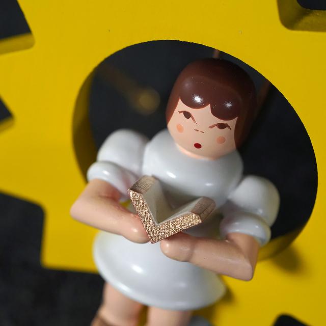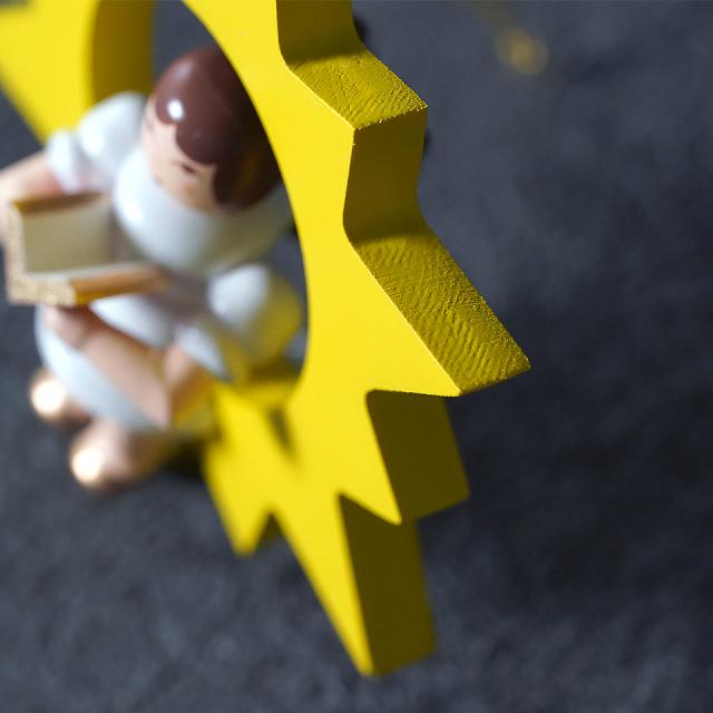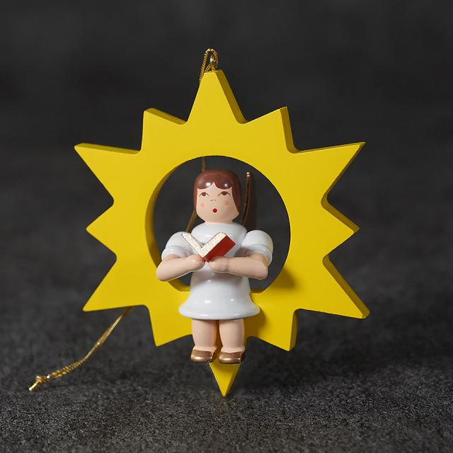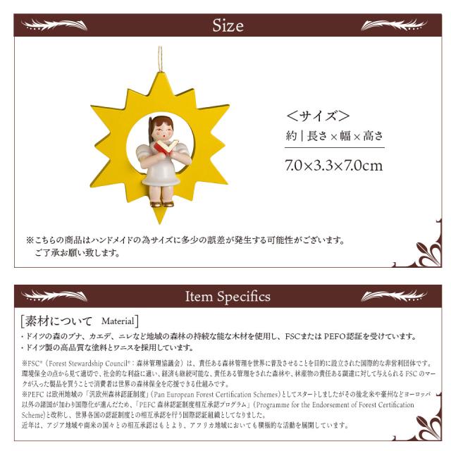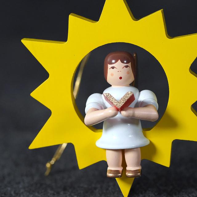 ★世界中で大人気、ドイツ東部にあるアルビン・プライスラー社のクリスマスオーナメント。かわいい天使が輝く星に腰掛けながら本を読んでいます。クリスマスにむけて讃美歌の練習をしているのでしょうか。