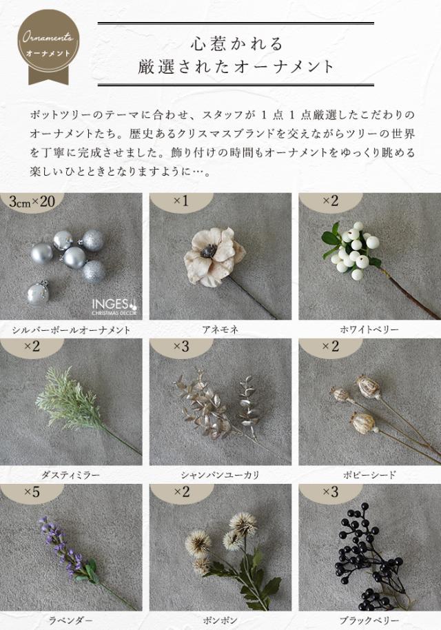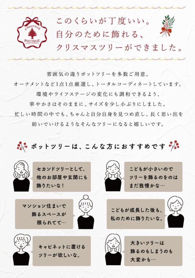慌ただしい日々の、心落ち着くわたしの居場所 季節が移り、あっという間にもうすぐクリスマス。 優雅に咲き誇るフラワーツリーがいつもの空間に華やぎと癒しを添える。 日々目まぐるしく変化する時代。だからこそ、美しい花を飾ろう。花のしなやかさと力強さが、本来の私を取り戻してくれる。 このくらいが丁度いい。自分のために飾れる、クリスマスツリーができました。 雰囲気の違うポットツリーを多数ご用意。 オーナメントなど1点1点厳選し、トータルコーディネートしています。 環境やライフステージの変化にも調和できるよう、 華やかさはそのままに、サイズを少し小ぶりにしました。 忙しい時間の中でも、ちゃんと自分自身を見つめ直し、長く思い出を紡いでいけるようなそんなツリーになると嬉しいです。 世界を代表するオーナメントブランドから厳選した、最高級のオーナメント。 歴史ある高級オーナメントブランドをメインに、一からデザインしたオリジナルアイテムを交えハイクラスのデコレーションツリーを目指しました。 品質の高さとこだわりで、クリスマスツリーに価値ある輝きをプラスします。 INGE-GLAS…伝統的なドイツの工芸地域、ドイツノイシュタットのコーブルクにあるクリスマスオーナメントの名門といわれる老舗メーカー。100年以上続くその技術は「クリスマスジュエリー」と言われる程美しく、世界各国で愛され続けています。 考えぬかれたトータルコーディネート フルセットでお届けします ポットツリーはクリスマスツリーに必要なアイテムを全てセットにしました。あれこれ買い足す必要がなく、届いたその日からすぐに飾れる豪華なツリーセットです。「自分のためのクリスマスツリー」を思う存分お楽しみください。 ラインが美しいボリュームたっぷりのツリー 2種類の形や濃淡の違う葉をミックスすることでボリュームあるクオリティの高いツリーに仕上げました。 枝葉の密度があるので、お好みの位置にオーナメントをレイアウトすることが可能です。後ろ側のボリュームは抑えめにすることで、壁面に近づけて飾れる省スペース設計です。 奥行きが狭い場所でも気軽に飾れるようにツリーの背面のボリュームは抑え、薄型のツリーに仕上げました。 心惹かれる厳選されたオーナメント ポットツリーのテーマに合わせ、スタッフが1点1点厳選したこだわりのオーナメントたち。歴史あるクリスマスブランドや、弊社オリジナルのオーナメントを交えながらツリーの世界を丁寧に完成させました。飾り付けの時間もオーナメントをゆっくり眺める楽しいひとときとなりますように…。 アンティーク調カップ型ポット[ゴールド] 長年使い込まれたようなシャビーな風合いが高級感と重厚感を演出しながらも華美になりすぎない上品なデザインに仕上げました。 オーナメントの魅力を際立たせるカップ型のポットです。 ※掲載している商品画像のオーナメントは前面を中心に飾り付けたイメージです。 |
