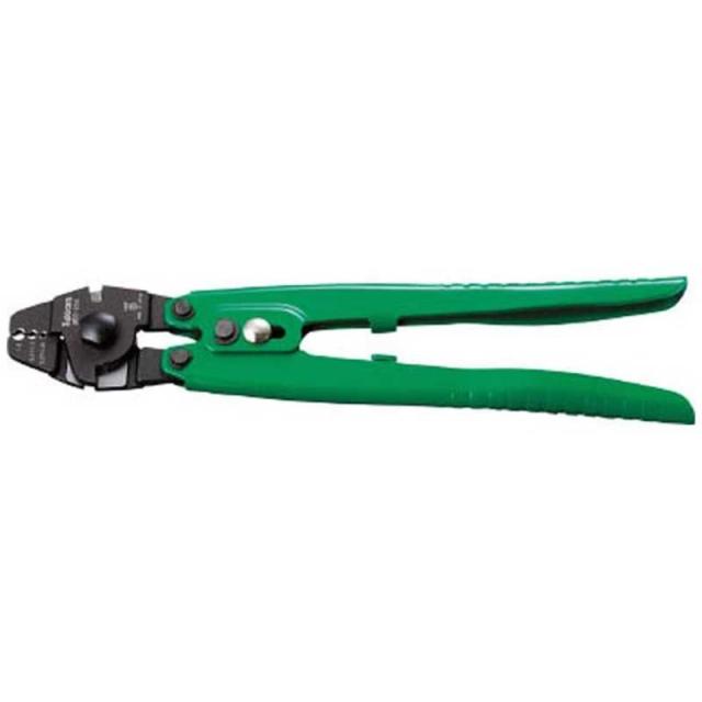 左右2枚の刃でワイヤーロープを切断し、3種の先端穴で各種クランプ管(アルミ管またはオーバルスリーブ)を圧着します。