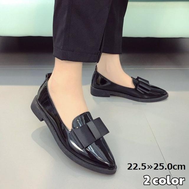 パンプス アーモンドトゥ レディース 靴 シューズ レザー調 リボン フラット ローヒール 美脚 軽量 防滑 ビジネスカジュアル