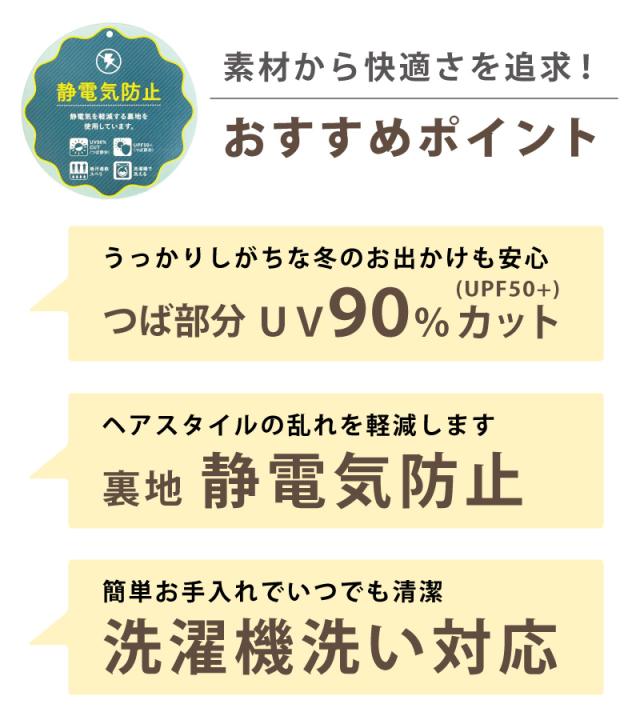 つば部分はUV90%カットとUPF50+なので、うっかりしがちな冬の日差し対策にも活躍します!