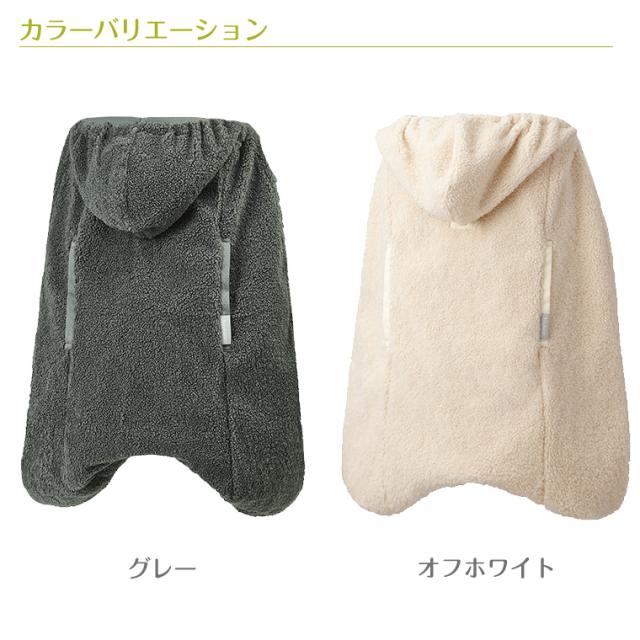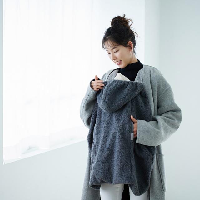 ゴムシャーリングで赤ちゃんの足もとをカバーし暖かさをキープ。前向き抱きを含む3通りの抱っこや、ベビーカーにも対応。手洗い可能でお手入れも簡単です。