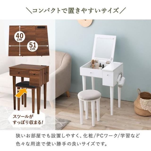ドレッサーデスク スツールセット 幅53cm 机&椅子セット 白 茶 天板裏ミラー 2口コンセント付き