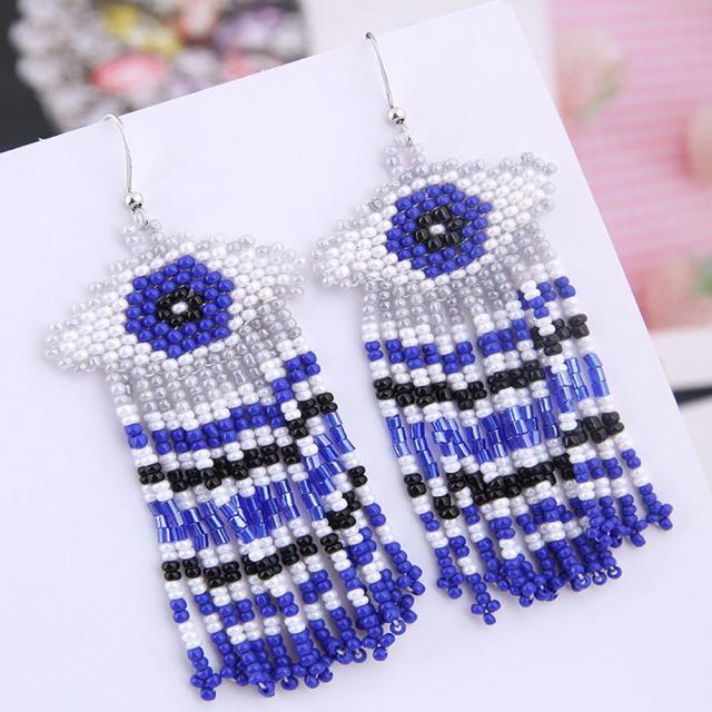 宇宙人やUFO、目玉や眼球のような黒色ブラックx白色ホワイトx青色ブルーx銀色シルバーグレーのカラフルなビーズで色鮮やかな天然石ビーズのようなアクリルビーズのボヘミアンスタイルのロングピアス。
