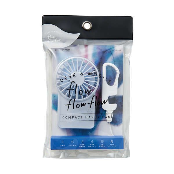 USB扇風機"flowflowflow"シリーズのスリムでコンパクトな充電式ハンディファンです。 持ち運びに便利なコンパクトサイズです。 7枚羽根と独自フレーム設計によりコンパクトサイズながら大風量を実現しています。 好みに合わせて3段階の風量調節ができます。 満充電で約1.2〜3.5時間の使用が可能です。(風量により使用可能時間が異なります。) ※充電しながら使用する際は、出力1.5A以上のAC充電器をご使用ください。 誤動作防止に配慮した、長押し電源ON/OFFボタン設計です。 リチウムポリマー電池を搭載しているため、充電し繰り返し使用できます。 付属のUSBケーブルを本製品の充電用USB(micro-B)ポートに接続し、対応したAC充電器に接続することで充電可能です。 ※AC充電器は付属していません。 LEDランプで充電・充電残量をお知らせします。 製品本体が自立するため、未使用時も場所をとらずにコンパクトです。 スタンドにもなる便利なカラビナストラップ付です。 過充電・過放電保護を備えた安心の回路設計です。