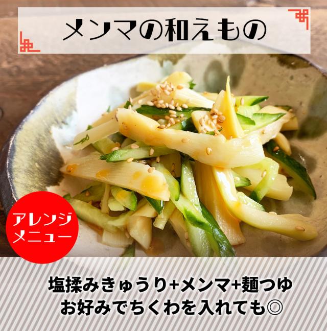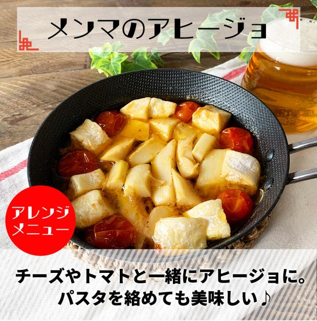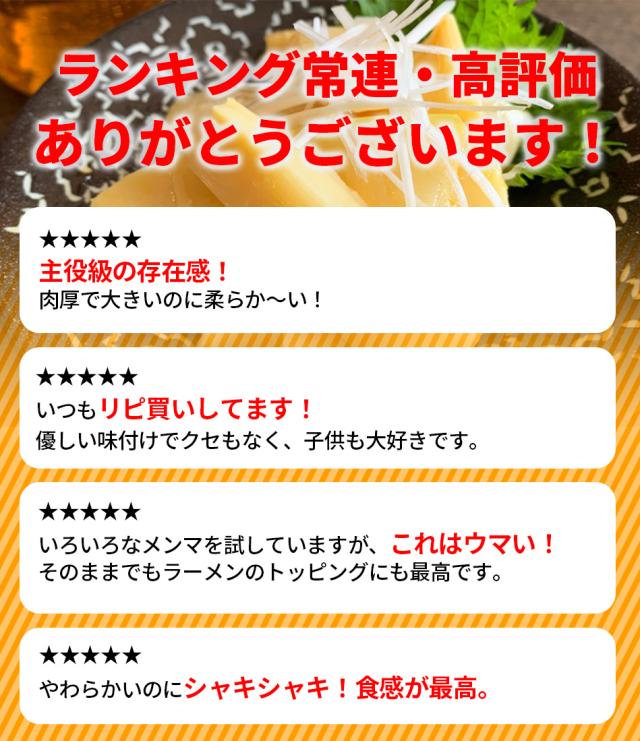 - 本当に美味しい。ご飯が進むので太っちゃう!位マジで歯ごたえが有り辛くないし大きさも有って大満足なメンマです。リピート確定です。