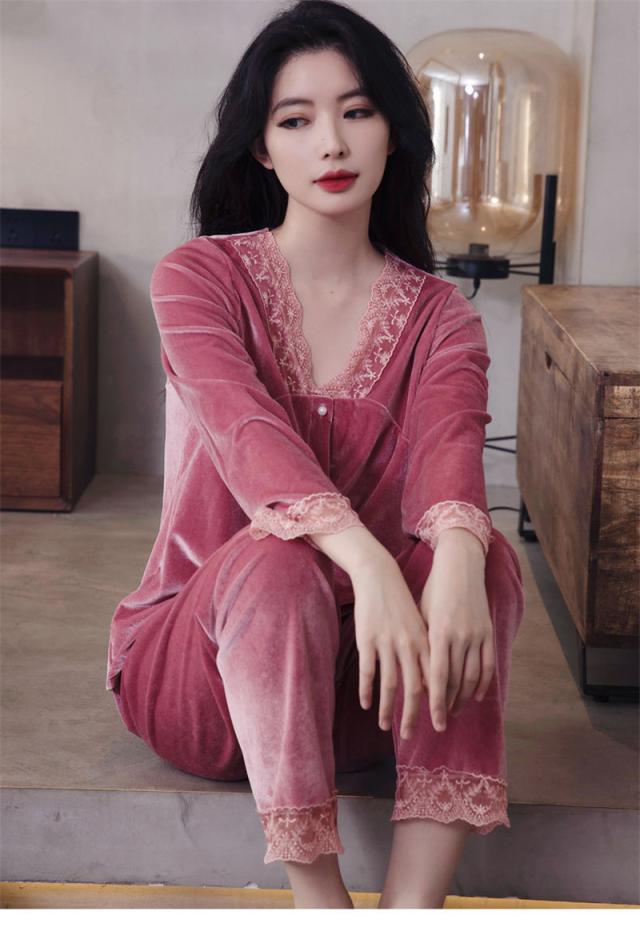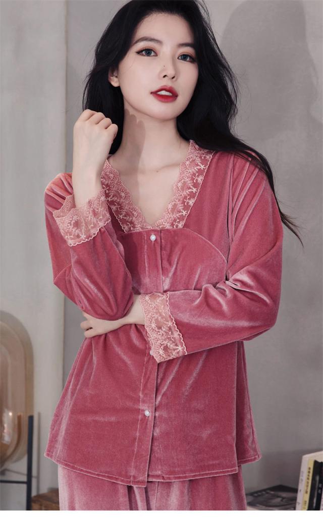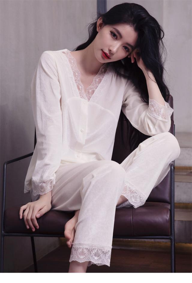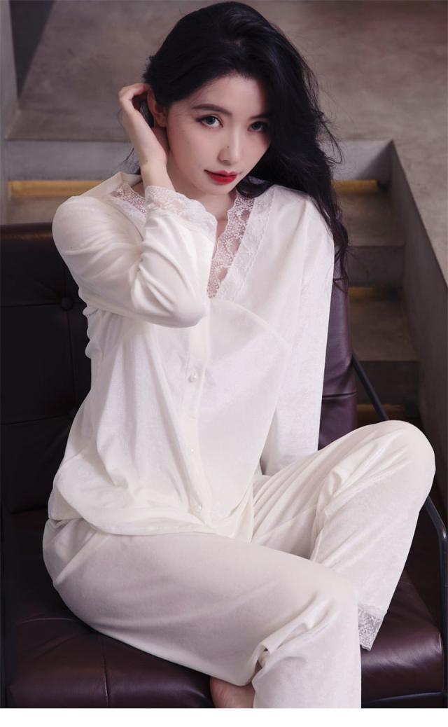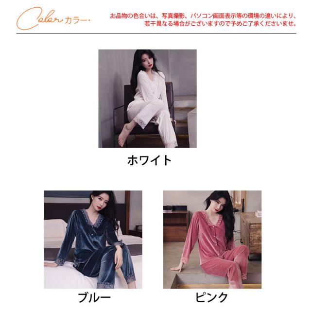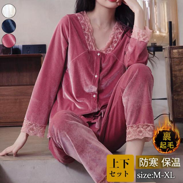 パジャマ レディース ルームウェア 上下セット 起毛 レース 寝巻き 長袖 Vネック ゆったり カジュアル 柔らか 高級感 エレガ