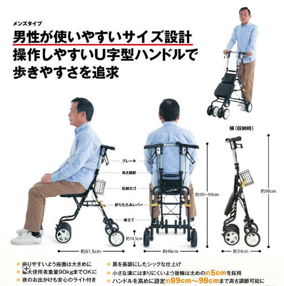 ・男性が使いやすいサイズ設計。U字ハンドルで歩きやすさを追求。