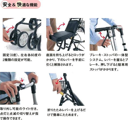 ●標準機能/折りたたみ、2WAYキャスター(左右60°、固定)、手元ブレーキ、駐車ブレーキ、座面、杖・傘立て