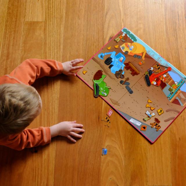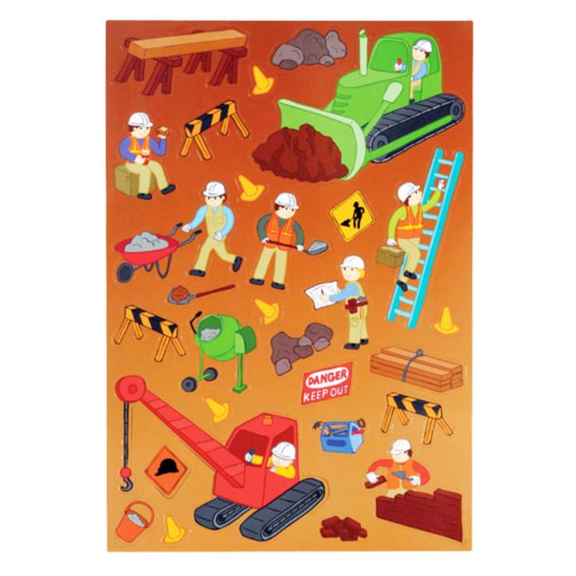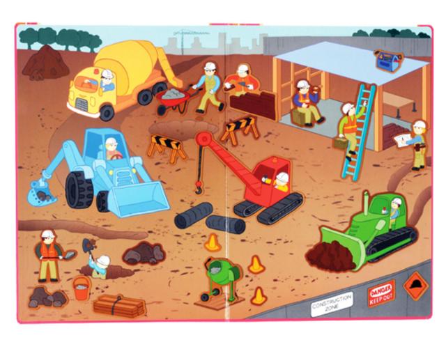 ●工事現場で働く人や乗り物のイラストのマグネットを、繰り返し貼って遊べるマグネットブックです。