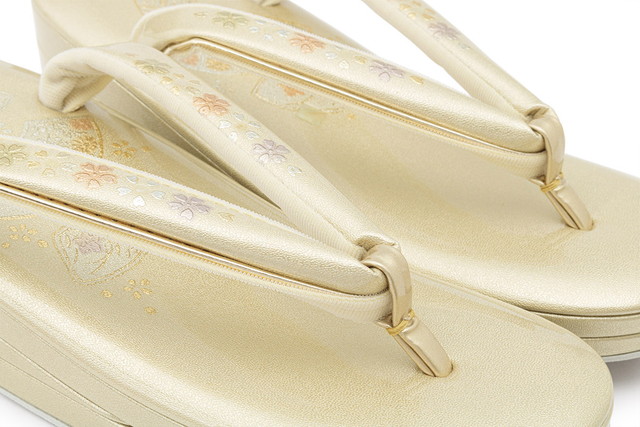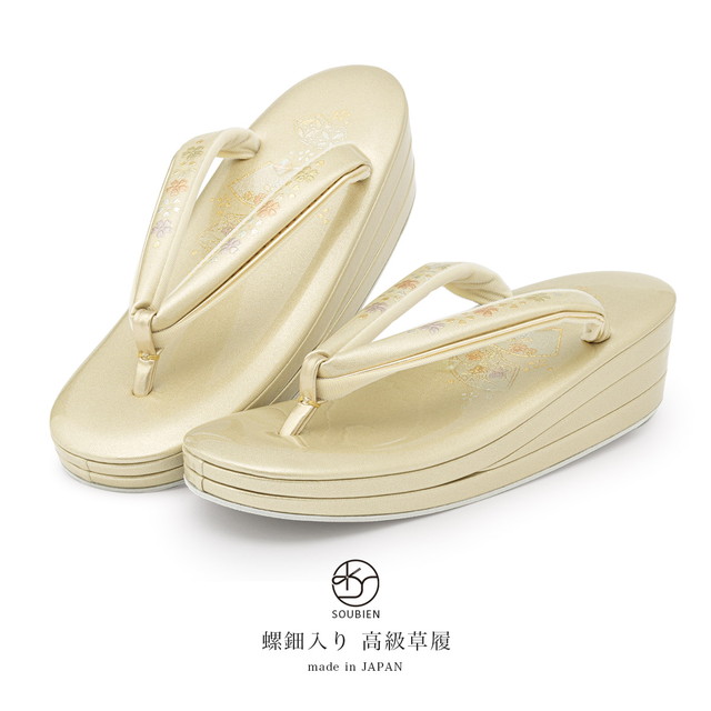 天と鼻緒には、扇子や桜の花々に虹色の貝殻の「螺鈿(らでん)」を散りばめた装飾が施され、フォーマルな場にふさわしい高級感を漂わせます。
