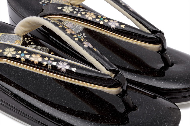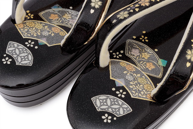 天と鼻緒には、扇子や桜の花々に虹色の貝殻の「螺鈿(らでん)」を散りばめた装飾が施され、フォーマルな場にふさわしい高級感を漂わせます。