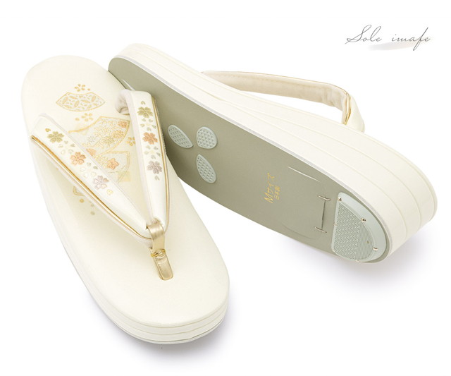 天と鼻緒には、扇子や桜の花々に虹色の貝殻の「螺鈿(らでん)」を散りばめた装飾が施され、フォーマルな場にふさわしい高級感を漂わせます。