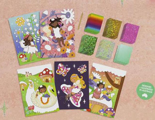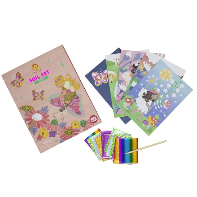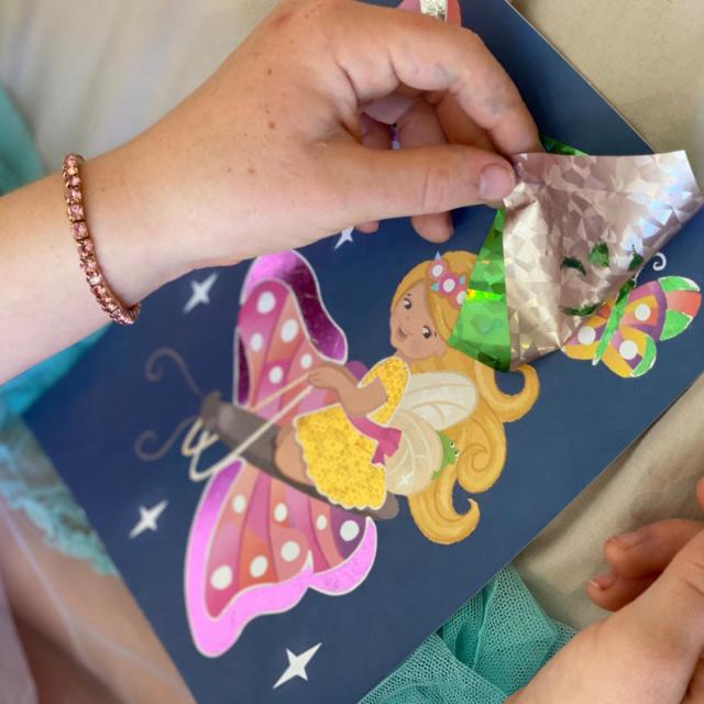 ネイルにも使われるホイルシートを使って、フェアリーのイラストの部分部分に色を付け、華やかに仕上げましょう。ホイルを指や竹ペンでこすって色をつけていきます。ハサミやのりは必要なく気軽にどこでも取り組めます。