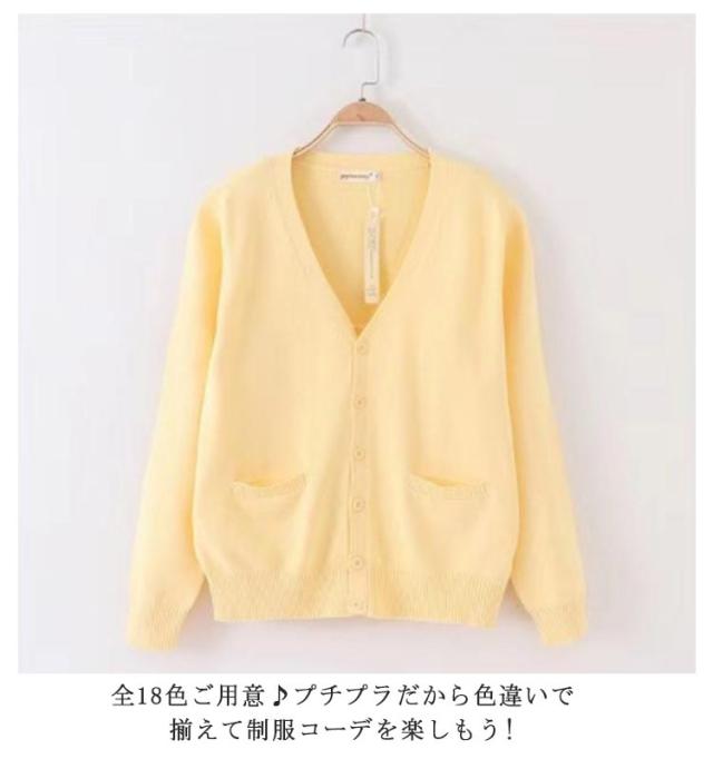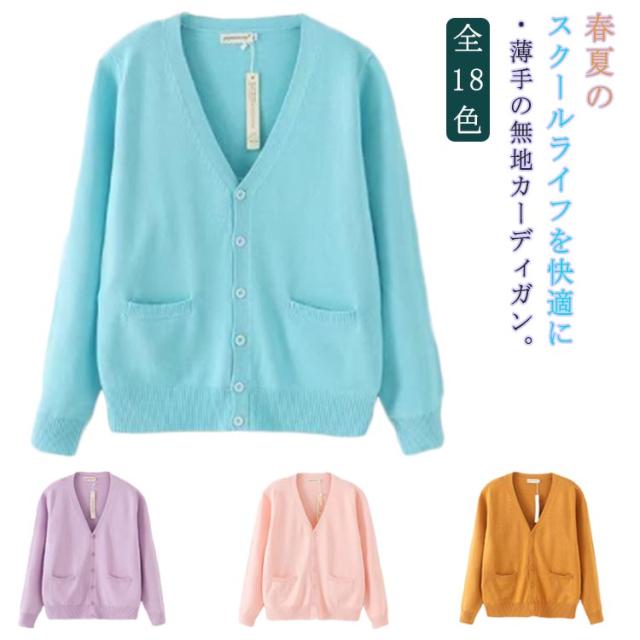| 春夏のスクールライフを快適に・薄手の無地カーディガン。 程よい厚みでジャケットを上から羽織っても着膨れせず、夏になるまで、肌寒い時に羽織れます。 インナーのブラウスの衿が綺麗に見えるように計算されたVネック深さです。 ゆったり着れるサイズ感で学校はもちろん、テーマパークやイベントでのコスプレもオシャレに決まる☆ 全18色ご用意♪プチプラだから色違いで揃えて制服コーデを楽しもう! | |