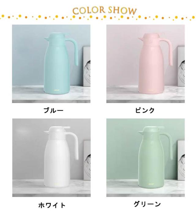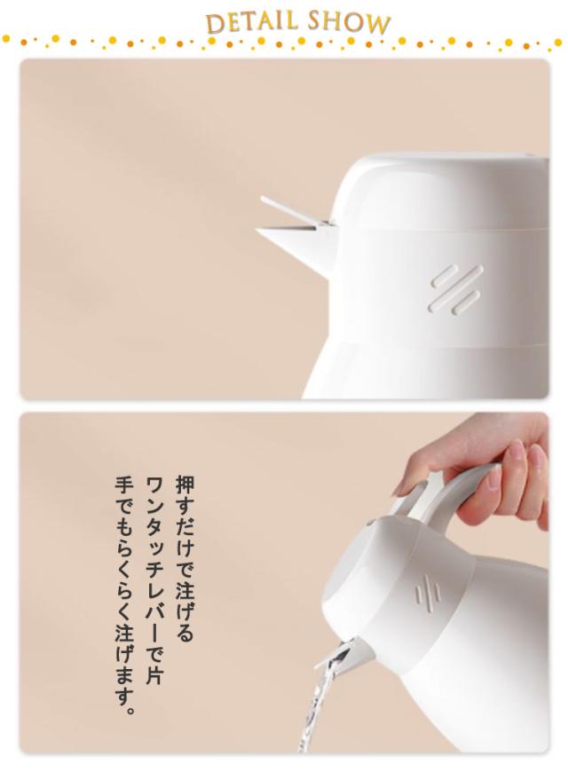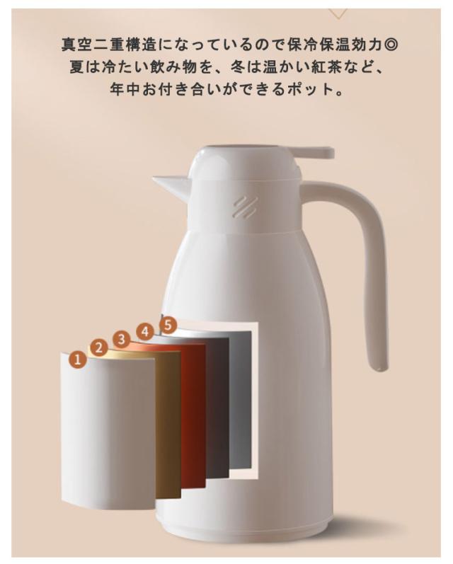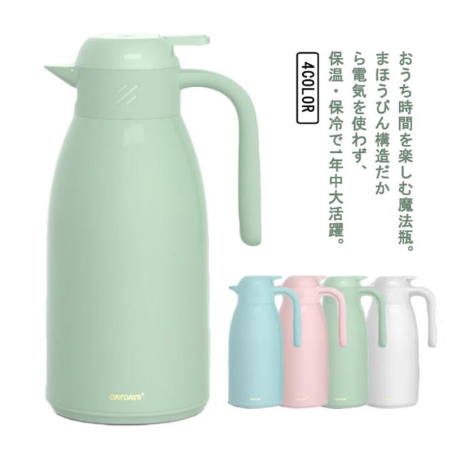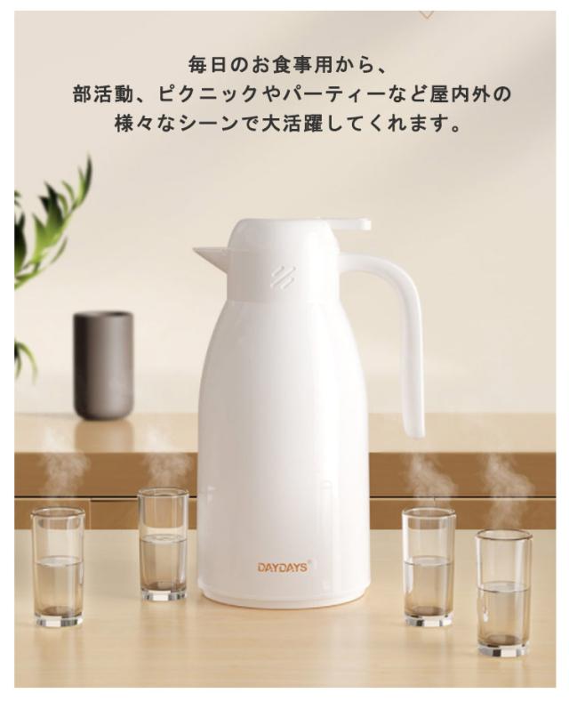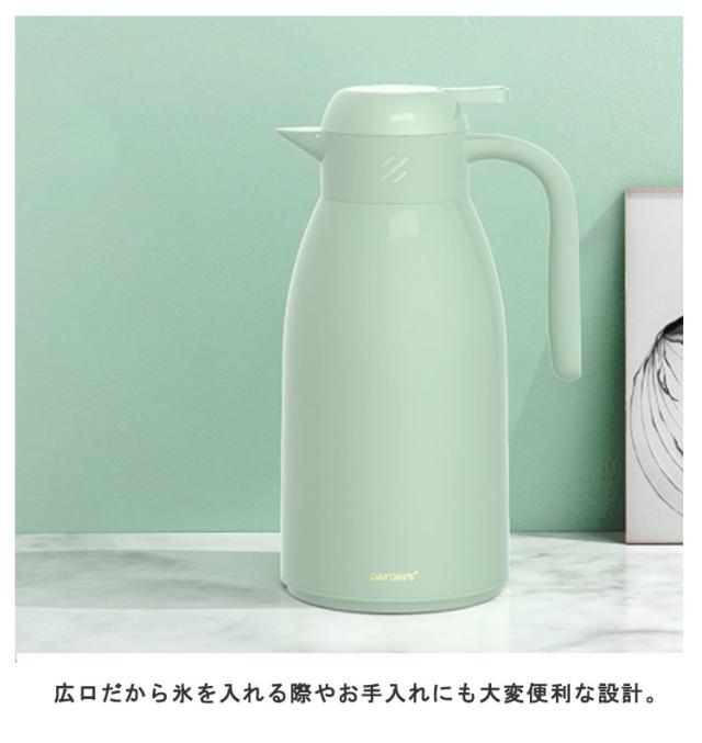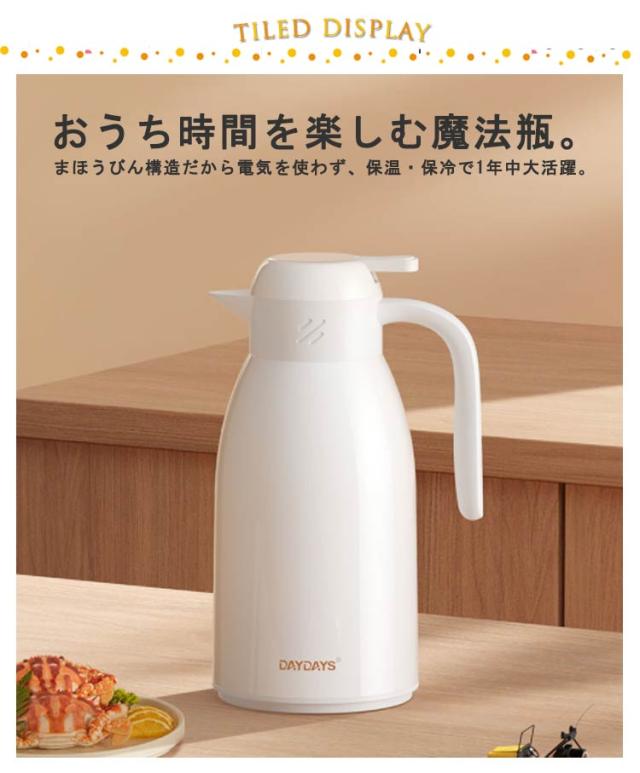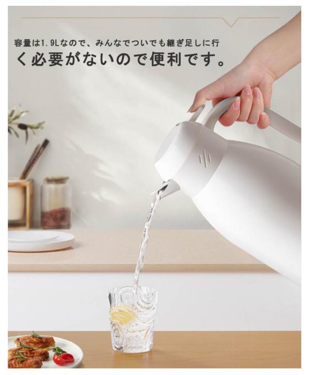| おうち時間を楽しむ魔法瓶。まほうびん構造だから電気を使わず、保温・保冷で1年中大活躍。 容量は1.9Lなので、みんなでついでも継ぎ足しに行く必要がないので便利です。 真空二重構造になっているので保冷保温効力◎夏は冷たい飲み物を、冬は温かい紅茶など、年中お付き合いができるポット。 ガラス製の中瓶!ステンレス製のポットとは違い、匂いうつりしにくく、茶渋汚れやコーヒーのステインなどもつきにくいのがポイント。 ふたが着脱でき、給水が簡単。 広ロだから氷を入れる際やお手入れにも大変便利な設計。 押すだけで注げるワンタッチレバーで片手でもらくらく注げます。 倒れても漏れにくい設計なので持ち運びにも便利です。 毎日のお食事用から、部活動、ピクニックやパーティーなど屋内外の様々なシーンで大活躍してくれます。 | |