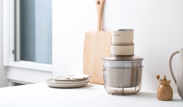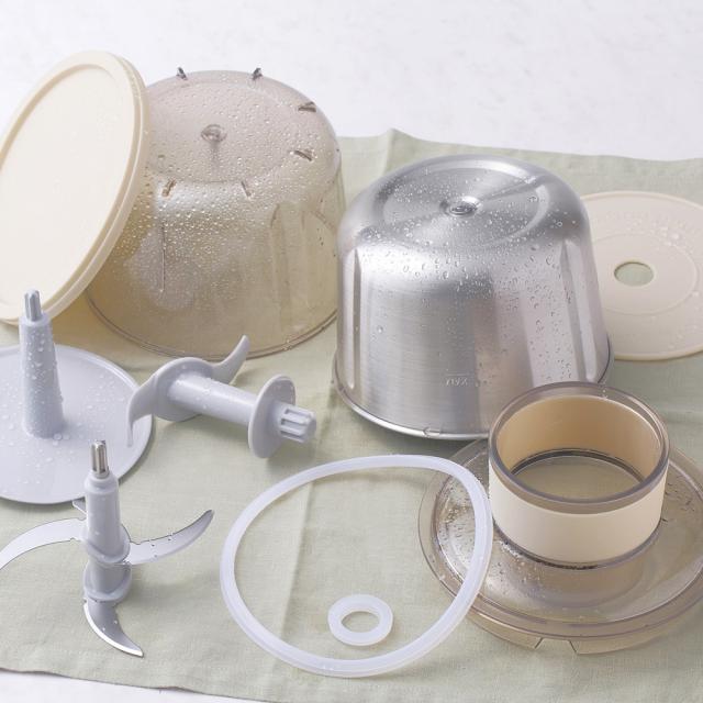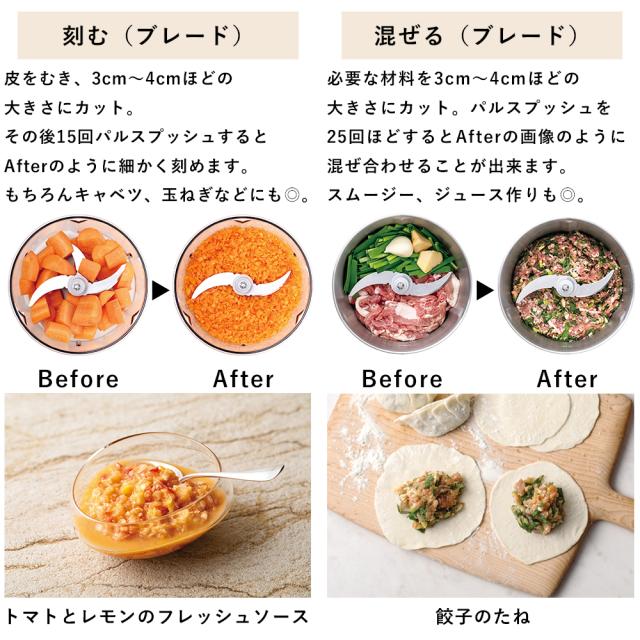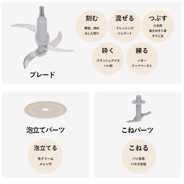 手間のかかる下ごしらえを1台でこなす。 みじん切りやペーストなど、ちょっと面倒な料理の下ごしらえはもちろん、生クリームやメレンゲの泡立て、力が必要となるパンやパスタ生地のこねまでできる”1台7役“の万能フードプロセッサー。 *:実用新案申請済み | 7つの嬉しい調理機能