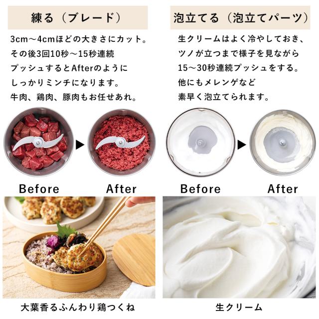 お肉を細かく包丁で刻むと飛び散る破片。床や洋服も汚れ、さらに小さなお子様がいるご家庭にとって生肉を口に入れてしまう危険性があります。フードプロセッサー コンボはしっかり蓋を閉めて混ぜるので飛び散る心配がありません。 (画像:右下)生クリーム / 約210g(乳脂肪分35%を使用) | 豪華なレシピブック付き