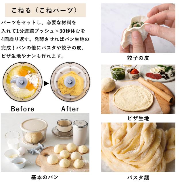 大人気商品のレコルト カプセルカッター ボンヌとの違いの一つである今回の【こねる】機能。お手軽にパン、ピザ生地、パスタ麺など幅広く調理ができます。