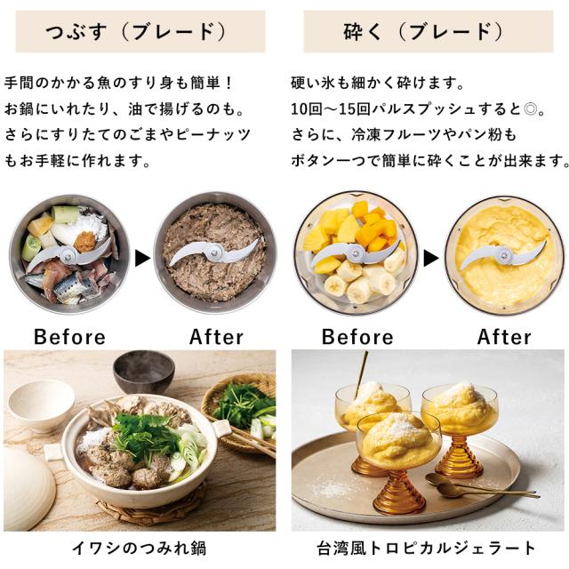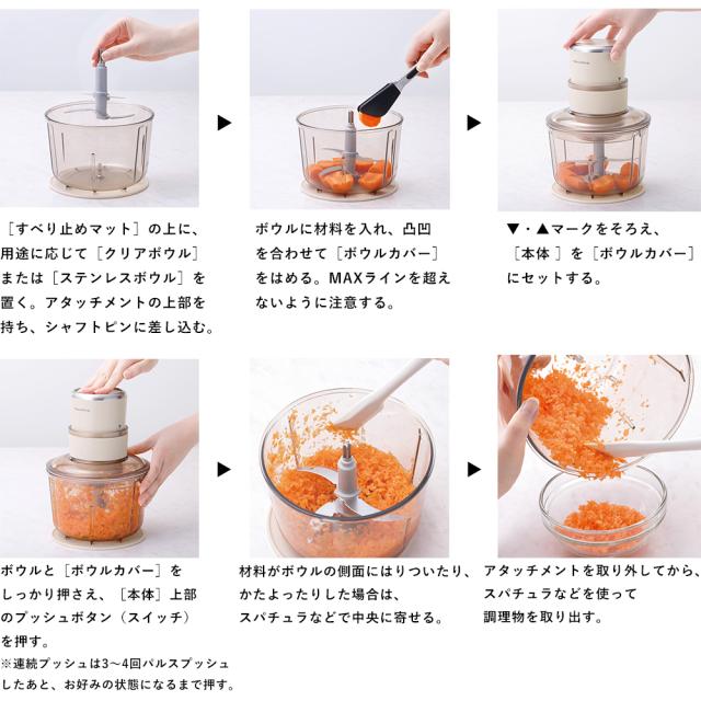 プッシュボタンの操作方法 パルスプッシュ:1回1秒を目安に、押す/離すを繰り返す (使用可能時間 ブレード:1分以内、泡立てパーツ・こねパーツ:4分以内) | 片付けもサッと洗ってカンタン・キレイ