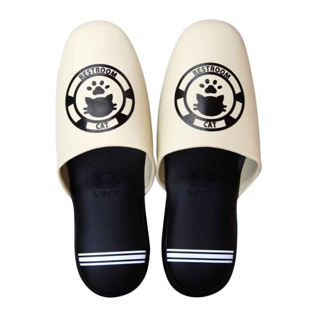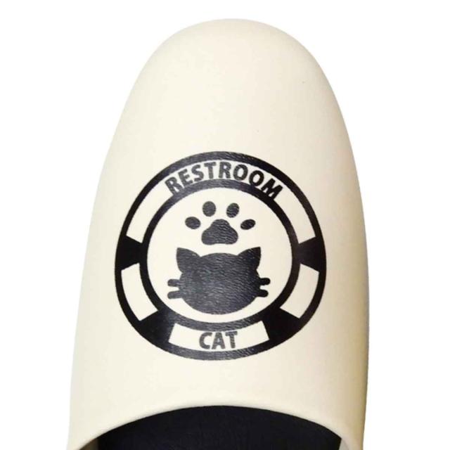 レストルームとキャットの文字入りデザインのスリッパです。トイレ用にお使い頂けます。撥水性のある材質なので汚れてもサッと拭けてお手入れ簡単です。