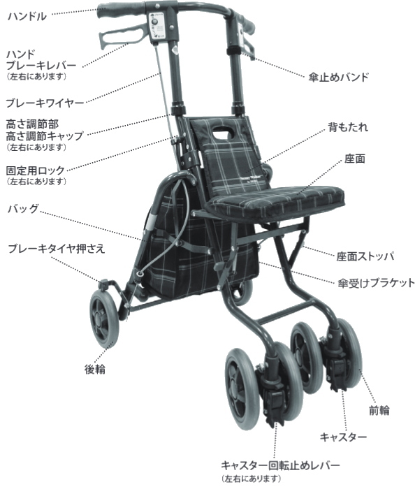 ●標準機能/折りたたみ、2WAYキャスター(左右60°、固定)、手元ブレーキ、駐車ブレーキ、座面、杖・傘立て