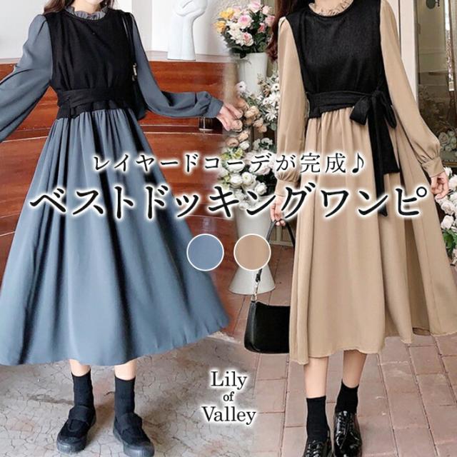 送料無料&即納★ ウエストリボン ベスト ドッキング ワンピース レディース 重ね着 カジュアル 上品 / 長袖 膝丈 ひざ下 ひざ丈 ミモレ丈 重ね着風 無地 フレアワンピース オフィスカジュアル リボン 大きいサイズ ハイウエスト フリル 紺 ベージュ ネイビー 秋冬 秋 冬 春