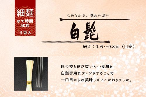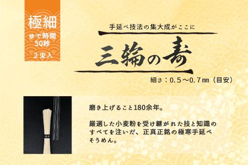 ●内容量:三輪の糸(太い帯紙)50g×3束 白髭(金色の帯) 50g×3束 三輪の寿(黒帯に銀字) 50g×2束 麺つゆ(3倍希釈)30ml×2袋