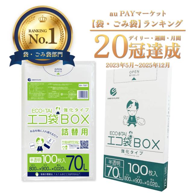 ポリ袋 ゴミ袋 箱タイプ 70リットル 薄手 半透明 80x90cm 0.020mm厚 1小箱(100枚)+詰替用(100枚) BX-730kt ごみ袋 70l ナチュラル サンキョウプラテック 送料無料