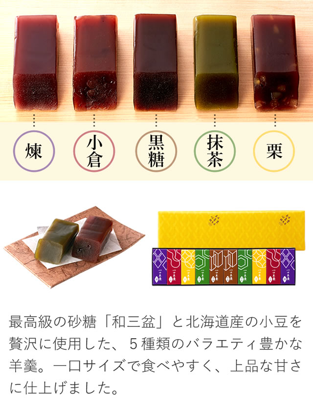 【黒糖】グラニュー糖(国内製造)、小豆生あん、黒砂糖、寒天、和三盆糖