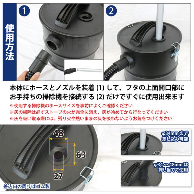 灰掃除を簡単に楽にする ●薪ストーブなどの灰取り作業が手軽に行えます その他に暖炉、BBQ、作業場などの灰や微細なほこりなどの清掃にも ご使用いただけます ●使用方法はお手持ちの掃除機(バキュームクリーナー)を本体に繋ぐだけ! ●差込口の周りはゴムになっていますので、接続する掃除機のホースサイズが φ34mmまでであれば差し込む事が可能です ●ホースサイズがφ34〜48mmの場合は、片方の手で差込口にホースを押し当ながら ご使用ください ●製品自体に集塵機能はありません ●灰を舞い上げることなく灰掃除が出来ます ●フィルターは水洗い可能でお手入れもラク ※ご購入前に、使用される掃除機のホースサイズを必ずご確認ください ※入荷時期により(カラーや仕様等)画像とは異なる場合も御座いますので ご了承ください 【ご注意】 ・灰の掃除は必ずストーブの火が完全に消え、灰が冷めてから行なってください ・灰を吸い取る際には、残り火や熱いままの灰を吸わないようお気をつけください 【交換用部品】 ・灰クリーナー専用 交換用フィルター 品番:ASC-20 |