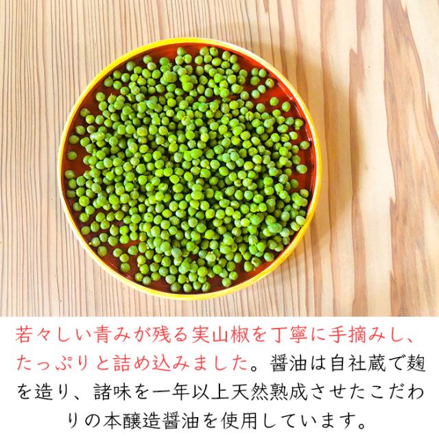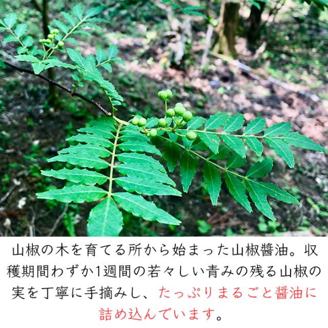 山椒の木を育てる所から始まった商品です。一年のうち、収穫時期は、わずか1週間ほどの若々しい青みの残る山椒の実を丁寧に手摘みし、たっぷりまるごと醤油に詰め込んでいます。フード・アクション・ニッポンアワード 2019 にて入賞産品に選定されました。