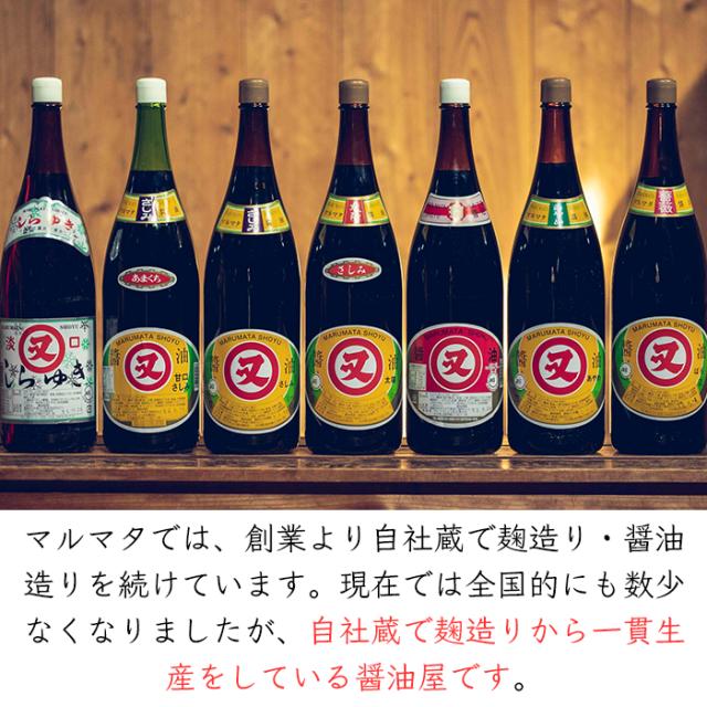 安政6年(1859年)創業のマルマタ(マルマタしょう油合)。現在では全国的にも数少なくなりましたが、マルマタでは、自社蔵で麹造りから一貫生産をしている醤油屋です。『原料を厳選→製麹(麹造り)→熟成→圧搾→瓶詰 出荷』と一貫した製造でお届けします。蔵で一年以上、天然熟成させた諸味を使い、味わい深くコクのある醤油を造り続けています。