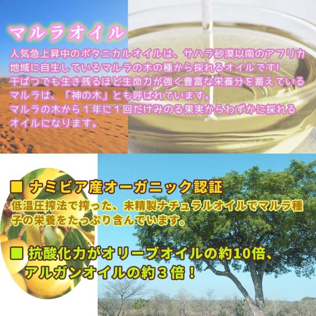 人気急上昇中のボタニカルオイルは、サハラ砂漠以南のアフリカ地域に自生しているマルラの木の種から採れるオイルです! 干ばつでも生き残るほど生命力が強く豊富な栄養分を蓄えているマルラは、「神の木」とも呼ばれています。 マルラの木から1年に1回だけみのる果実からわずかに採れるオイルです。
