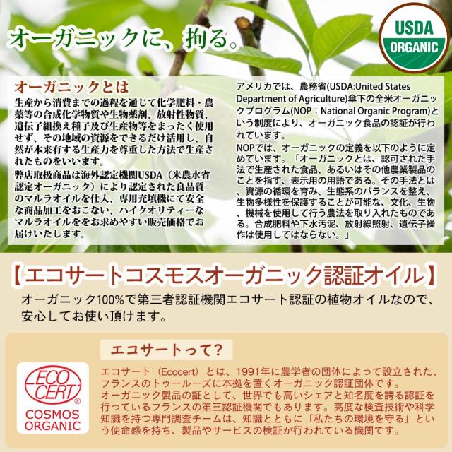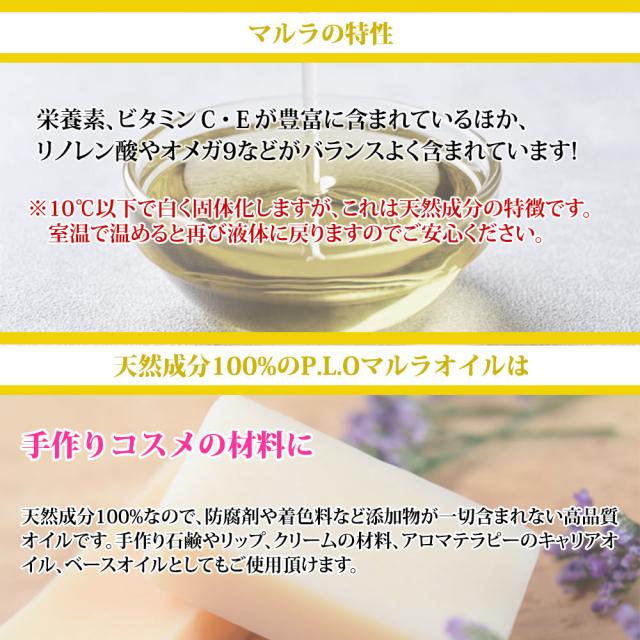 ・10℃以下で白く固体化しますが、これは天然成分の特徴です。室温で温めると再び液体に戻りますのでご安心ください。 ・電子レンジは使用しないでください。温度が上昇し、火傷の原因となる可能性があります。 ・天然・未精製品の為、季節やロットによって香りの強弱がある場合があります。マルラ特有の香りの為、劣化臭ではないかとご心配される方がおられますが、品質には全く問題ございません。安心してご使用ください。
