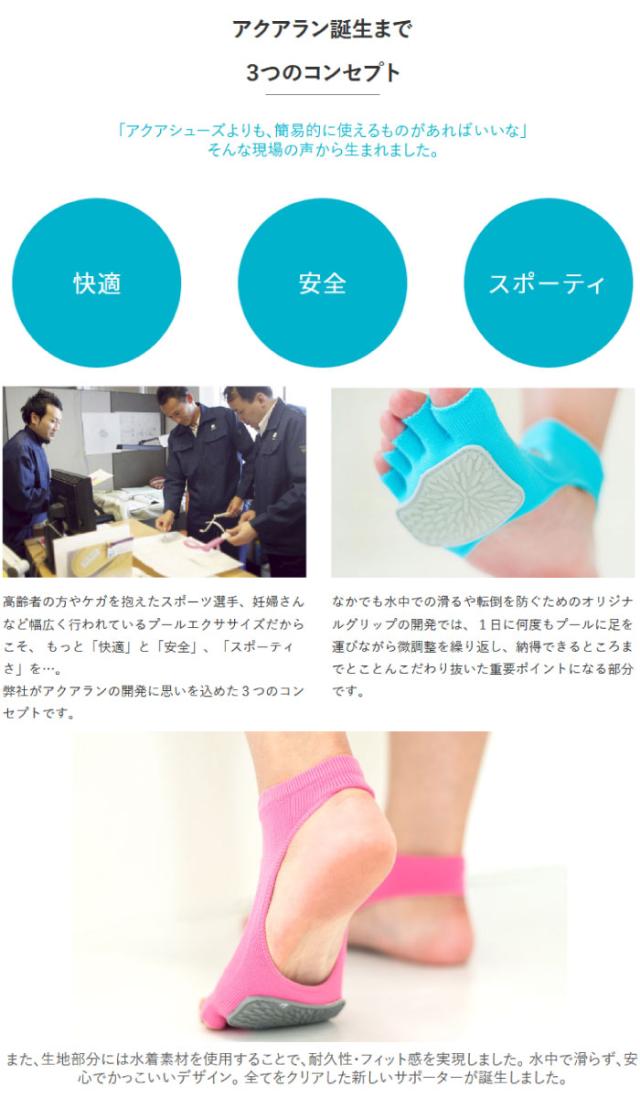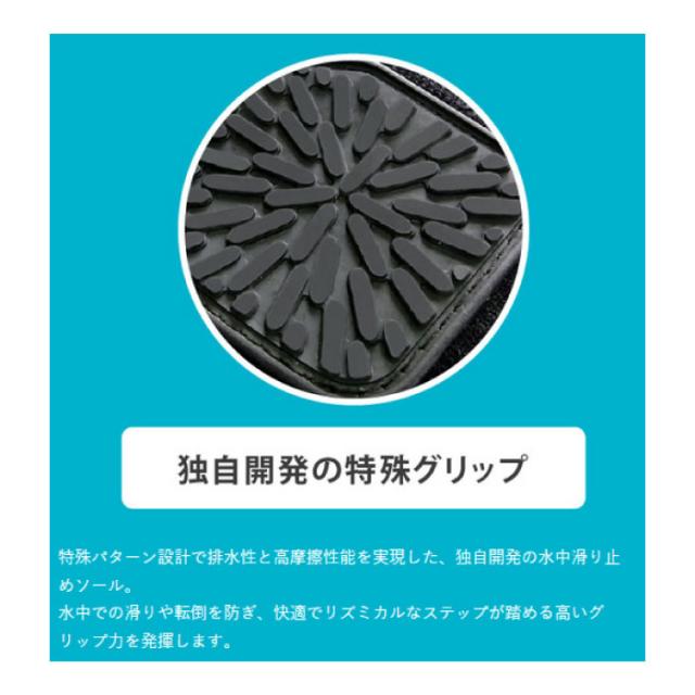 水着の素材を参考に柔軟性と排水性を兼ね揃えたオリジナル生地を開発。30種類の中から現行の生地をセレクト。激しい動いても破れず、だけどお手入れは簡単。また、5本指靴下の開発を参考に指先開放型を採用。ふんばる力をサポートしより快適なアクアライフの手助けをします。特殊パターン設計で排水性と高摩擦性能を実現した、独自開発の水中すべり止めソール。水中での滑りや転倒を予防し、快適でリズミカルなステップが踏める高いグリップ力を発揮します。また快適なすべり止めソールに加えまるで素足のような軽さが特徴。足への負担を軽減します。