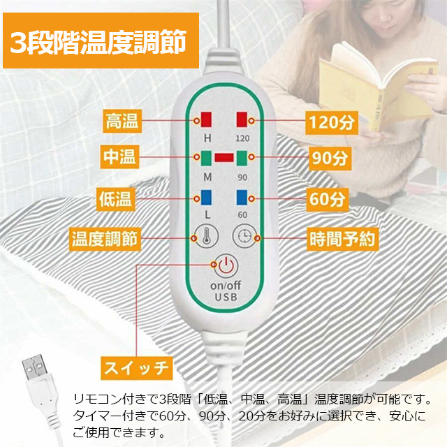 【USB給電式】 リモコン付きで3段階の低温 中温 高温 温度調節が可能です。タイマー付きで60分 90分 120分 選択できて安心してご使用できます。